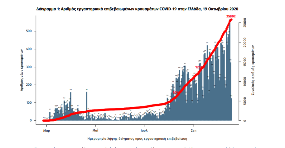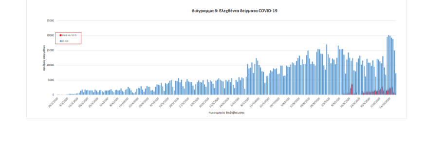 Δείγματα που έχουν ελεγχθεί: Από την 1η Ιανουαρίου 2020 μέχρι σήμερα, στα εργαστήρια που διενεργούν ελέγχους για τον νέο κορωνοϊό (SARS-CoV-2) και που δηλώνουν συστηματικά στον ΕΟΔΥ το σύνολο των δειγμάτων που ελέγχουν, έχουν συνολικά ελεγχθεί 1549392 κλινικά δείγματα ενώ από Μονάδες Υγείας και Κλιμάκια του ΕΟΔΥ που διενεργούν ελέγχους Rapid Ag έχουν ελεγχθεί 35856 δείγματα