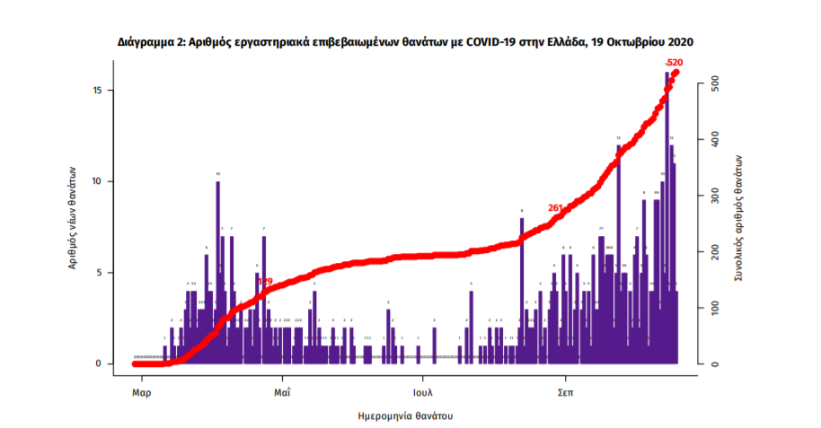 Τέλος, έχουμε 11 ακόμα καταγεγραμμένους θανάτους και 520 θανάτους συνολικά στη χώρα. 197 (37.9%) γυναίκες και οι υπόλοιποι άνδρες. Η διάμεση ηλικία των θανόντων συμπολιτών μας ήταν τα 79 έτη και το 96.2% είχε κάποιο υποκείμενο νόσημα ή/και ηλικία 70 ετών και άνω.
