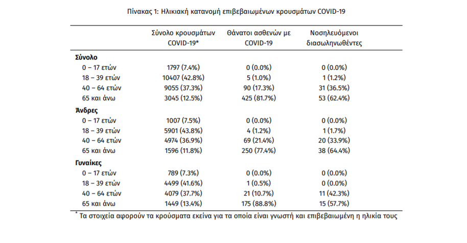 Από το σύνολο των 25802 κρουσμάτων, 3560 (13.8%) θεωρούνται σχετιζόμενα με ταξίδι από το εξωτερικό, 10337 (40.1%) είναι σχετιζόμενα με ήδη γνωστό κρούσμα και τα υπόλοιπα δεν σχετίζονται ούτε με ταξίδι ούτε με άλλο γνωστό κρούσμα ή είναι ακόμα υπό διερεύνηση. Η μέση ηλικία των κρουσμάτων είναι 39 έτη (εύρος 0 έως 102 ετών), ενώ η μέση ηλικία των θανάτων είναι 79 έτη (εύρος 25 έως 102 ετών). Η ηλικιακή κατανομή των (α) συνολικών κρουσμάτων, (β) των περιστατικών που κατέληξαν σε θάνατο και (γ) των ασθενών που νοσηλεύονται διασωληνωμένοι, είναι η ακόλουθη