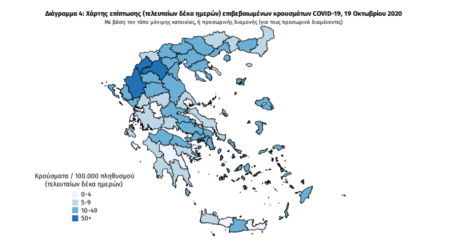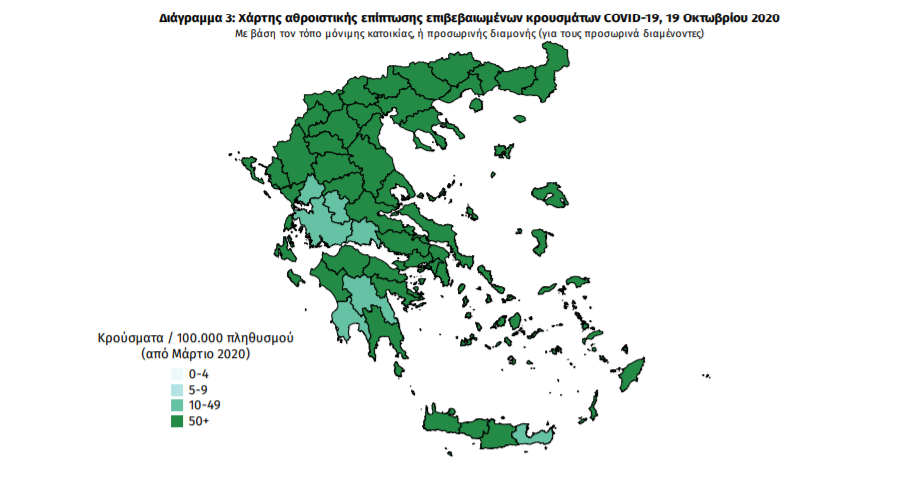Ο χάρτης αποτυπώνει τη γεωγραφική κατανομή των συνολικών κρουσμάτων COVID-19 (από την αρχή της επιδημίας) ανά Περιφερειακή Ενότητα της χώρας, με βάση την δηλωθείσα διεύθυνση μόνιμης κατοικίας του ασθενούς, ή τη διεύθυνση προσωρινής διαμονής για τους τουρίστες και άλλους προσωρινά διαμένοντες στην Ελλάδα. Συμπεριλαμβάνονται τόσο κρούσματα με ιστορικό ταξιδίου (“εισαγόμενα”) όσο και κρούσματα με πιθανή εγχώρια μετάδοση.