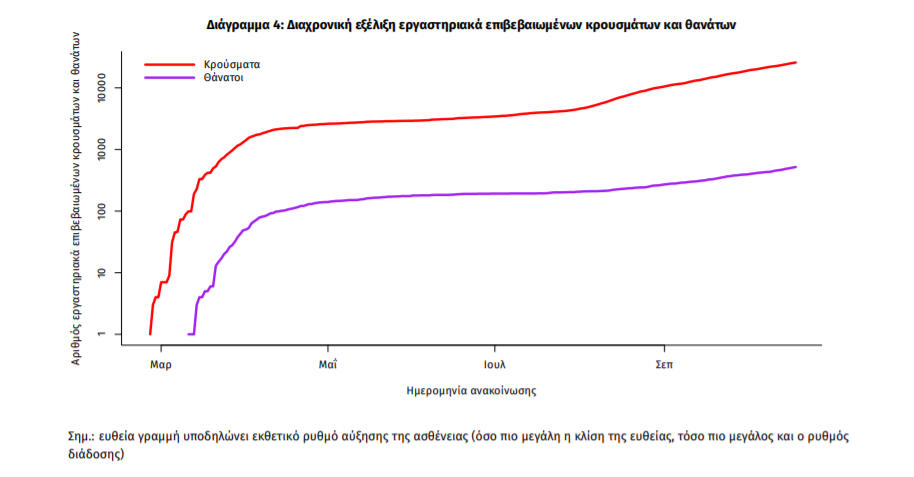 Η διαχρονική εξέλιξη των συνολικών κρουσμάτων και συνολικού αριθμού των θανάτων ασθενών COVID-19 παρουσιάζεται στο ακόλουθο διάγραμμα (σε λογαριθμική κλίμακα)