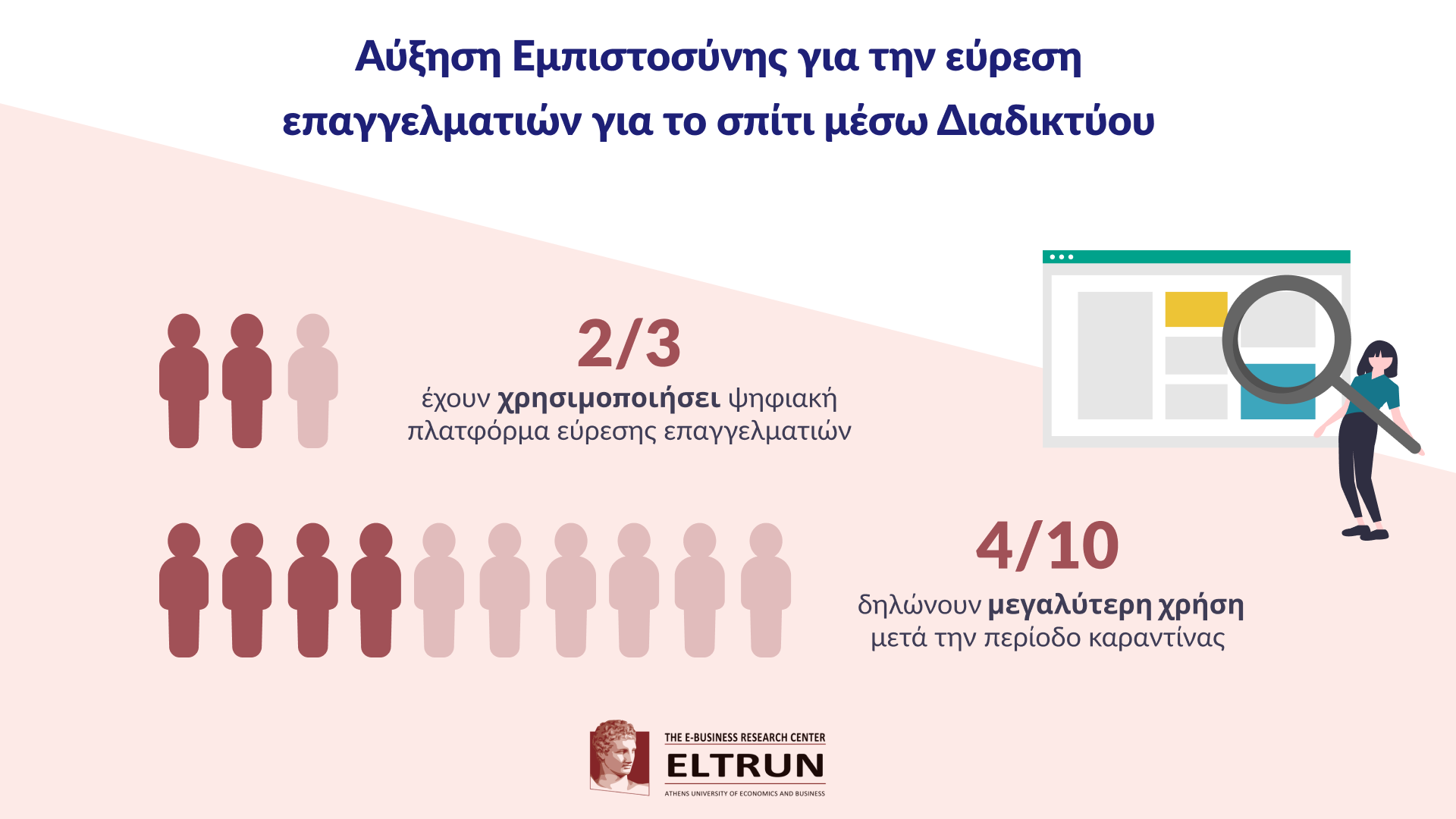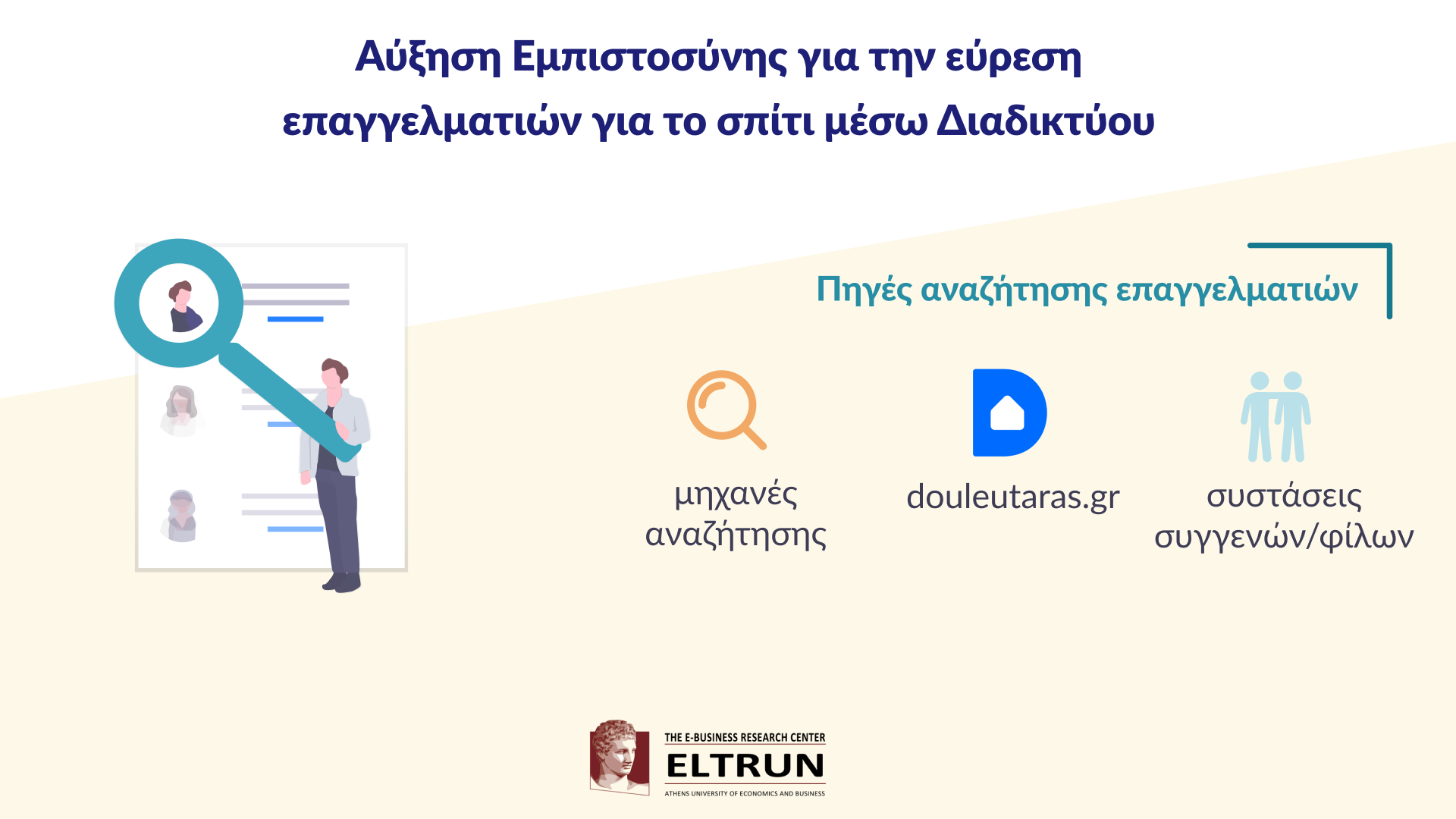 Μετά την περίοδο παραμονής στο σπίτι λόγω COVID-19 και στο πλαίσιο ψηφιοποίησης πολλών υπηρεσιών στη χώρα μας, το Εργαστήριο Ηλεκτρονικού Εμπορίου του Οικονομικού Πανεπιστημίου Αθηνών (ELTRUN)πραγματοποίησε μελέτη σε χρήστες του διαδικτύου προκειμένου να διερευνήσει την επίδραση της καραντίνας στην εμπιστοσύνη των καταναλωτών στις διαδικτυακές πλατφόρμες εύρεσης επαγγελματιών για εργασίες που αφορούν στο σπίτι.