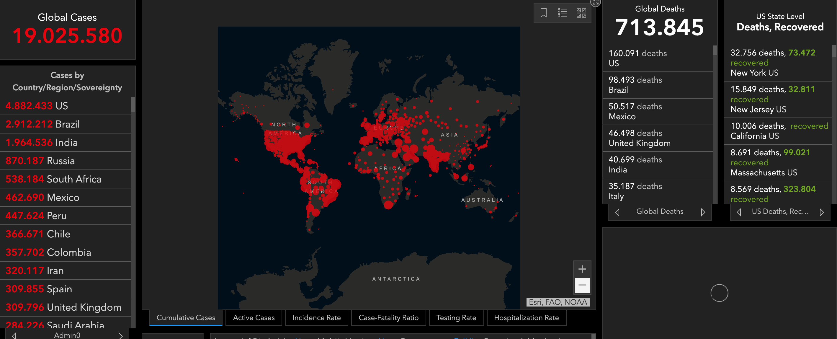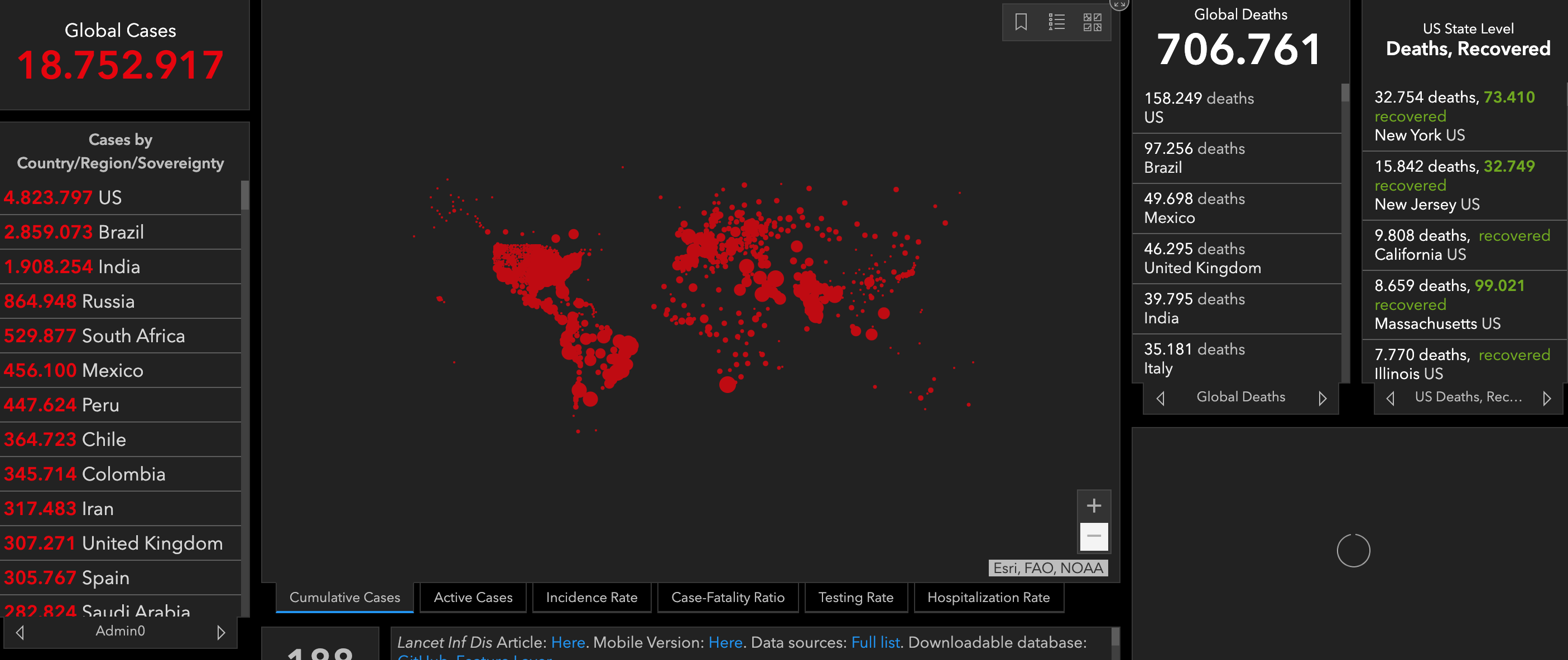 Σε παγκόσμια κλίμακα, έχουν επιβεβαιωθεί σχεδόν 19 εκατομμύρια κρούσματα μόλυνσης. Η πανδημία έχει στοιχίσει τη ζωή σε πάνω από 709.000 ανθρώπους επί του παρόντος.