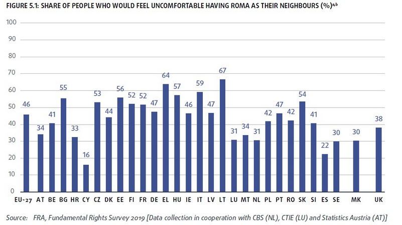 Όσον αφορά στο θέμα του αντιτσιγγανισμού, η έκθεση εκφράζει τις ανησυχίες της για την επιμονή αυτής της μορφής ρατσισμού, επικαλούμενη αποτελέσματα από την έρευνα του FRA το 2019, η οποία έδειξε ότι σχεδόν ο μισός πληθυσμός στην ΕΕ- 27 δήλωσε ότι θα ένιωθε άβολα έχοντας τους Ρομά για γείτονες.