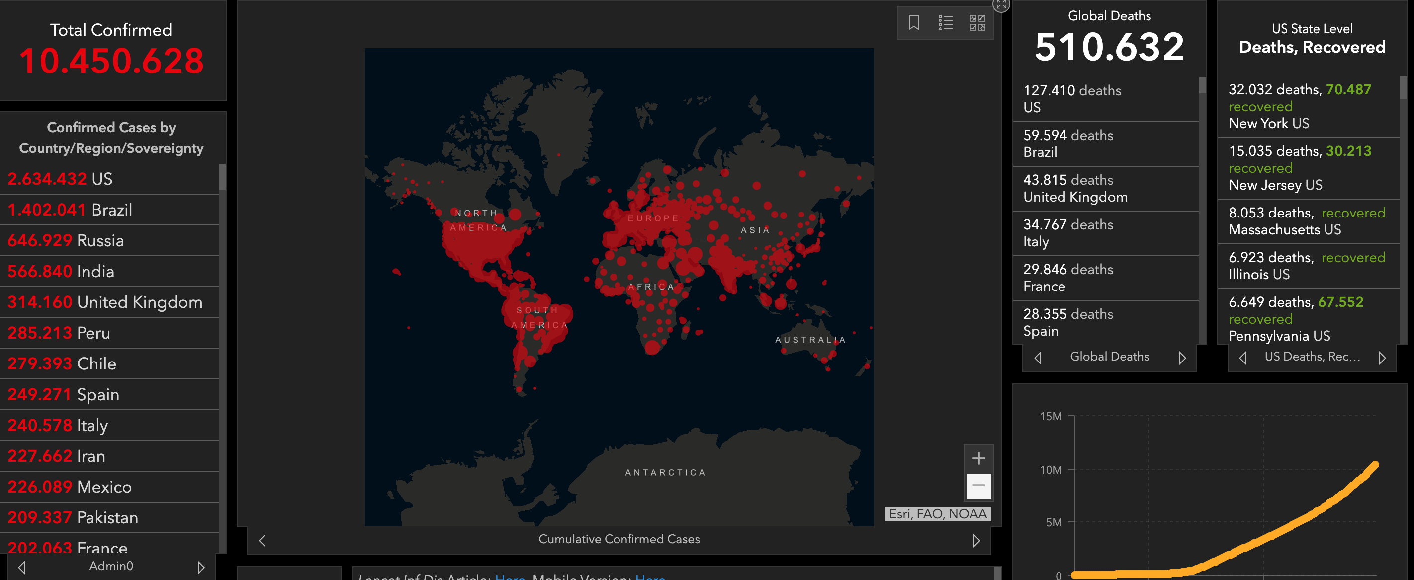 Περισσότερα από 10.450.628 κρούσματα της Covid-19 έχουν διαγνωστεί επισήμως σε 196 χώρες και εδάφη από την έναρξη της επιδημίας. Τουλάχιστον 5.207.900 άνθρωποι θεωρείται ότι έχουν αποθεραπευτεί.