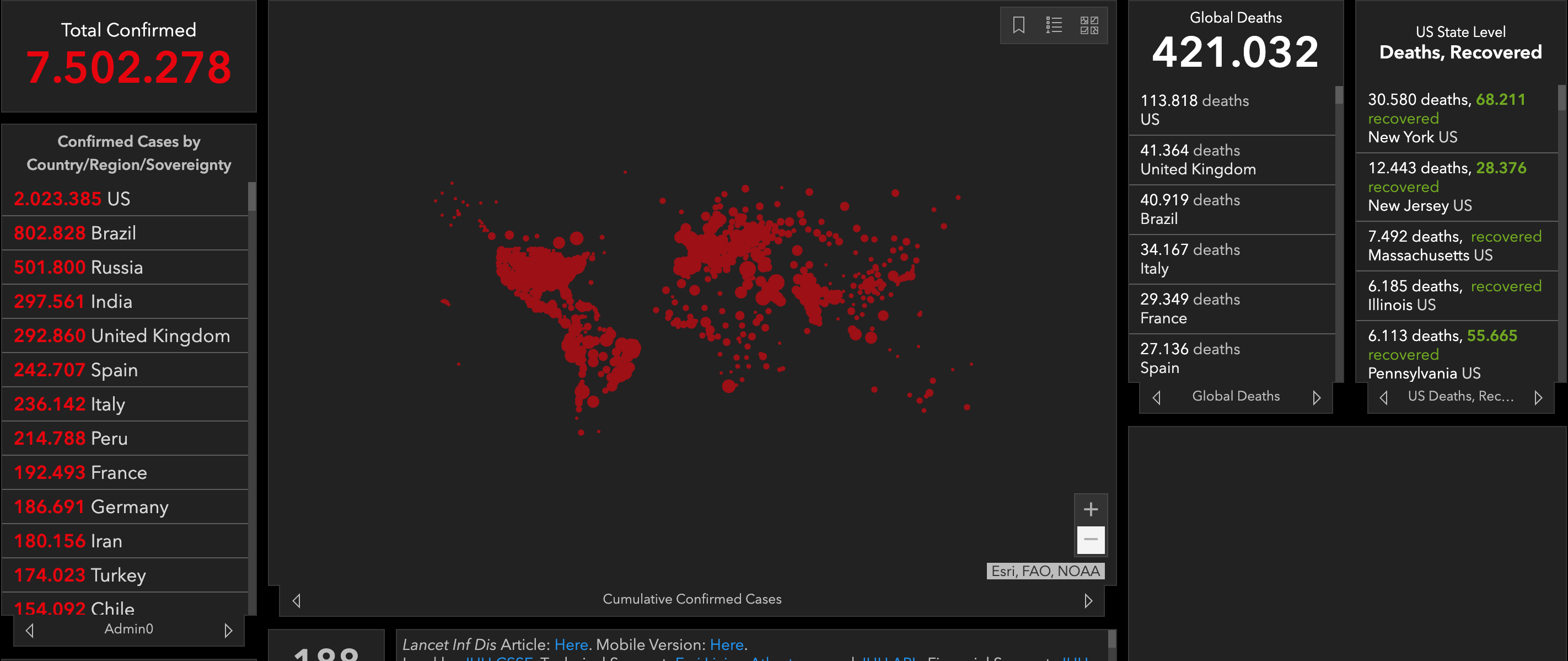 Περισσότεροι από 7.502.278 άνθρωποι έχουν διαγνωστεί με κορονοϊό επίσημα σε 196 χώρες και εδάφη από την έναρξη της επιδημίας, από τους οποίους τουλάχιστον 3.308.400 θεωρούνται θεραπευμένοι.
