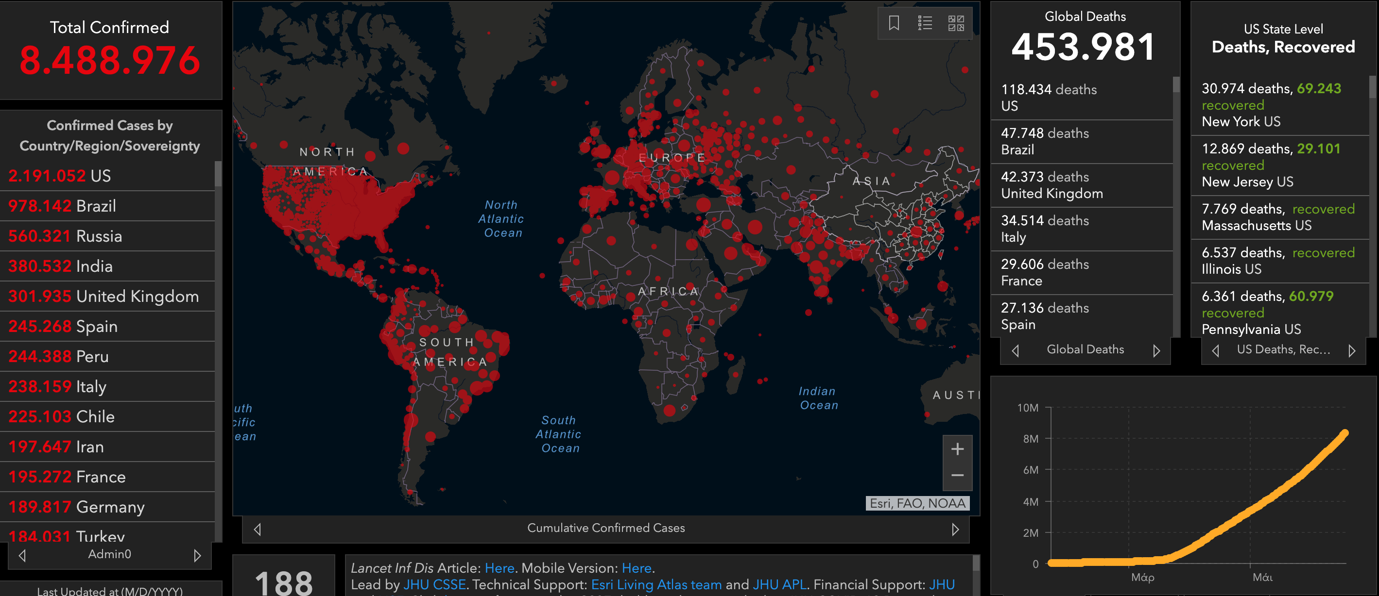 Περισσότεροι από 8.488.976 άνθρωποι έχουν διαγνωστεί με κορονοϊό επίσημα σε 196 χώρες και εδάφη από την έναρξη της επιδημίας, από τους οποίους τουλάχιστον 3.866.200 θεωρούνται θεραπευμένοι.