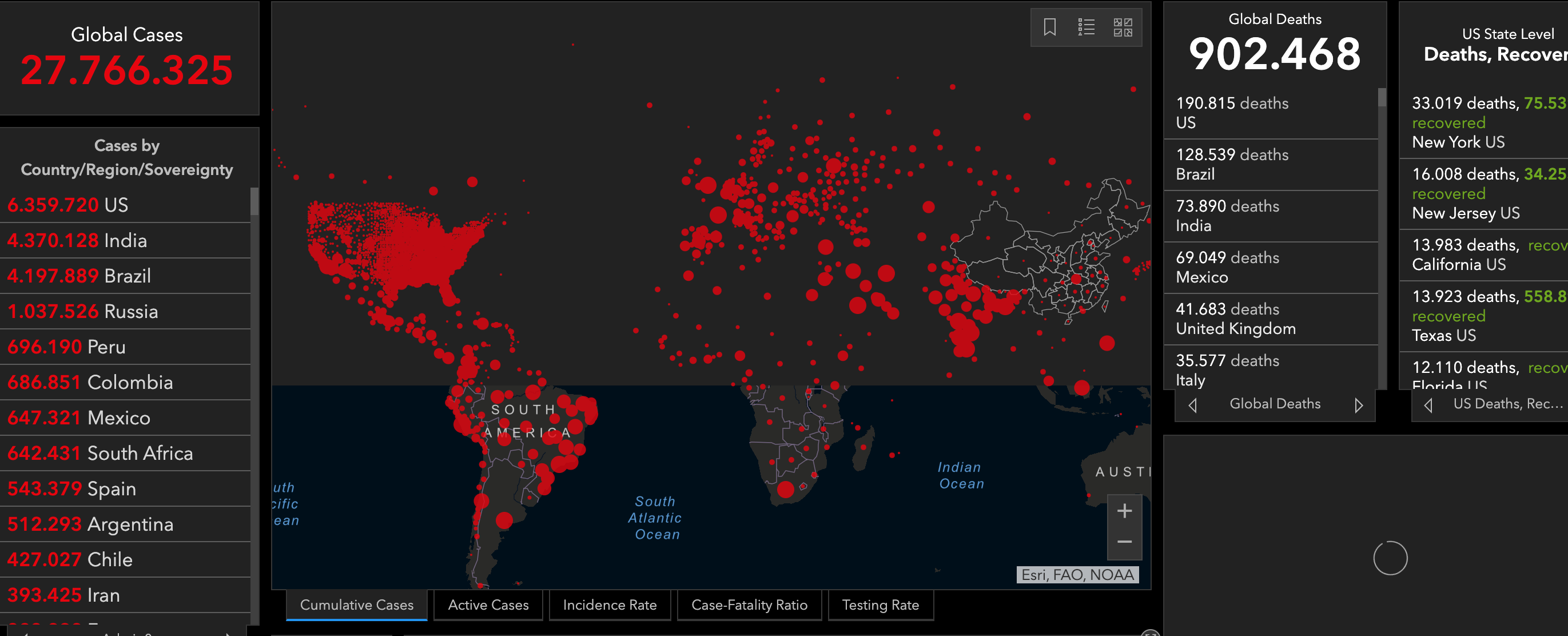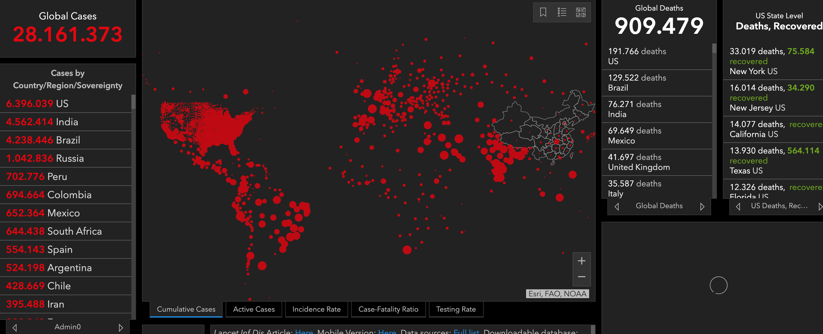 Μέχρι τις 04:00 ώρα Ελλάδας, ο αριθμός των μολύνσεων σε όλο τον κόσμο ανέρχεται σε 28.047.828. Περισσότεροι από 907.000 άνθρωποι έχουν πεθάνει έχοντας διαγνωστεί με τον ιό, πρόσθεσε το Πανεπιστήμιο.