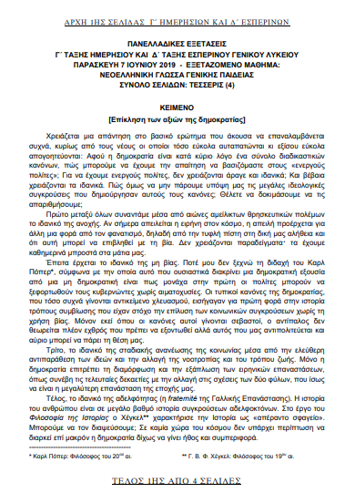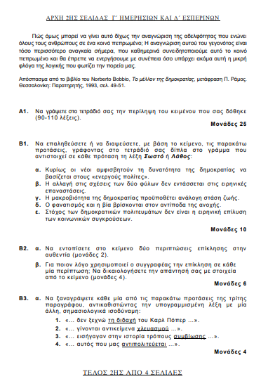 Σε κείμενο – απόσπασμα από το βιβλίο του Norberto Bobbio, Το μέλλον της δημοκρατίας, μετάφραση Π. Ράμος, Θεσσαλονίκη: Παρατηρητής, 1993, σελ. 49-51 “Επίκληση των αξιών της δημοκρατίας” κλήθηκαν να αναπτύξουν και να απαντήσουν οι μαθητές των Γενικών Λυκείων της χώρας στην πρεμιέρα των Πανελλαδικών 2019.