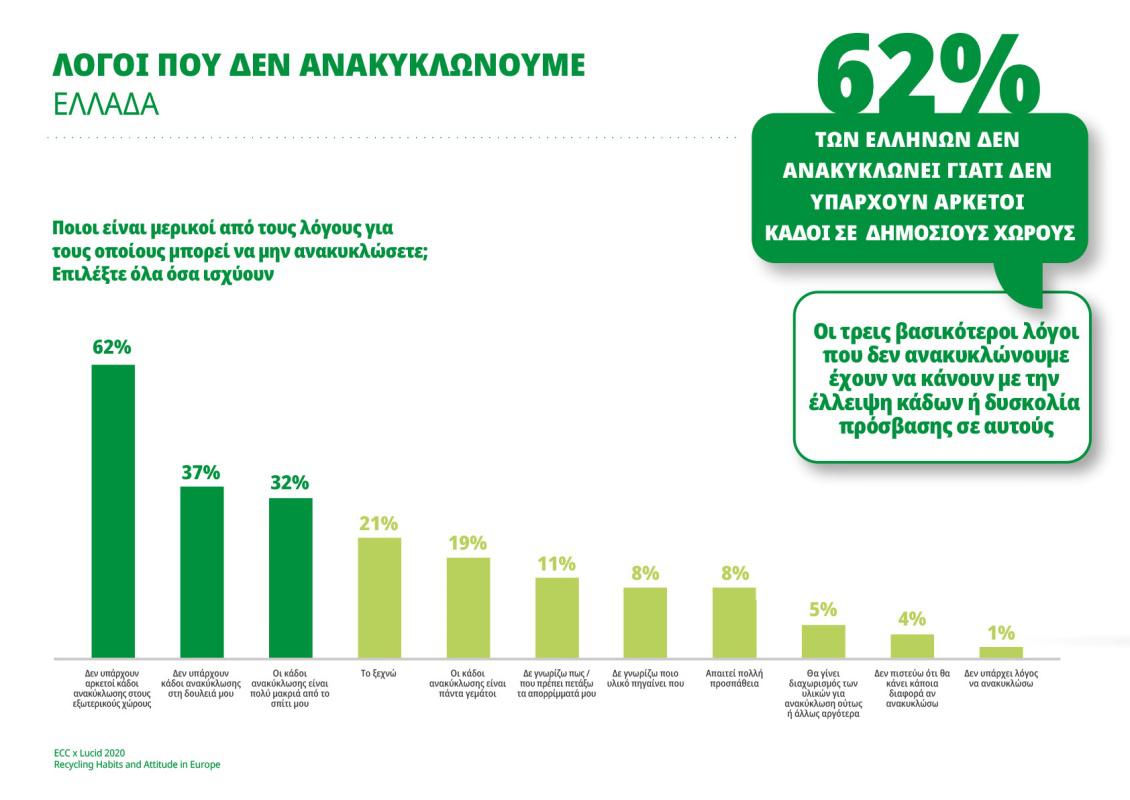 Τα παραπάνω ευρήματα έρχονται σε συνέχεια της είδησης ότι 86% των Ευρωπαίων πιστεύει πως είναι πιο σημαντικό από ποτέ να ανακυκλώνουμε. Παρά τη δυναμική στροφή του κόσμου ως προς την προστασία του περιβάλλοντος, φαίνεται ότι το μεγαλύτερο εμπόδιο στο να πετύχουμε υψηλότερα ποσοστά ανακύκλωσης έχει να κάνει με την έλλειψη υποδομών. Έτσι, η δημοσκόπηση έδειξε ότι ένα συντριπτικό 96% των Ελλήνων θέλει να δει περισσότερους κάδους ανακύκλωσης στους δρόμους, αλλά και σε δημόσιους χώρους όπως είναι τα πάρκα και οι παραλίες.
