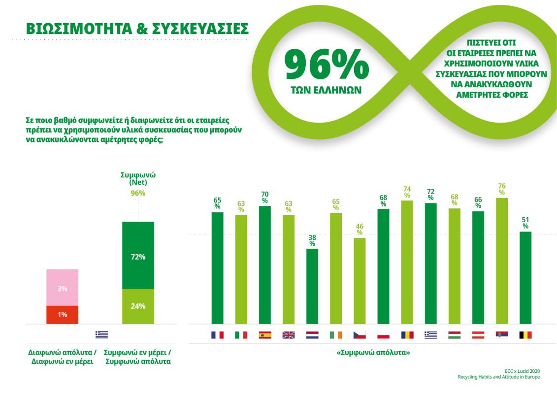 Ενώ το 94% πιστεύει ότι οι εταιρείες θα πρέπει να χρησιμοποιούν συσκευασίες που μπορούν να ανακυκλωθούν αμέτρητες φορές.