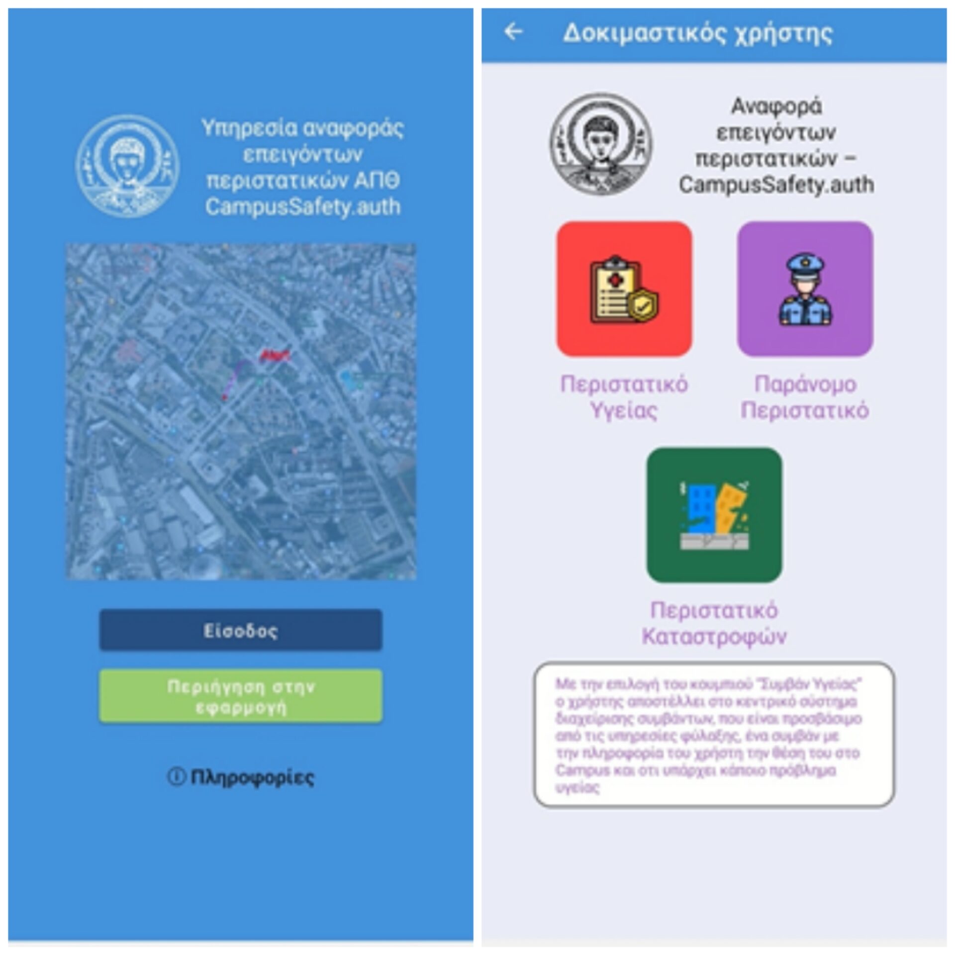 Ένα άγγιγμα στην εφαρμογή, στην οθόνη του κινητού τηλεφώνου οποιουδήποτε μέλους της πανεπιστημιακής κοινότητας κινείται στο campus και αναγνωρίζει κάποια απειλή ασφάλειας ή κίνδυνο για την υγεία του, θα είναι αρκετό για την άμεση κινητοποίηση της υπηρεσίας ασφάλειας του ΑΠΘ και την αντιμετώπιση του περιστατικού.
