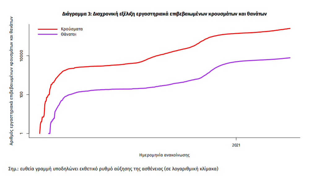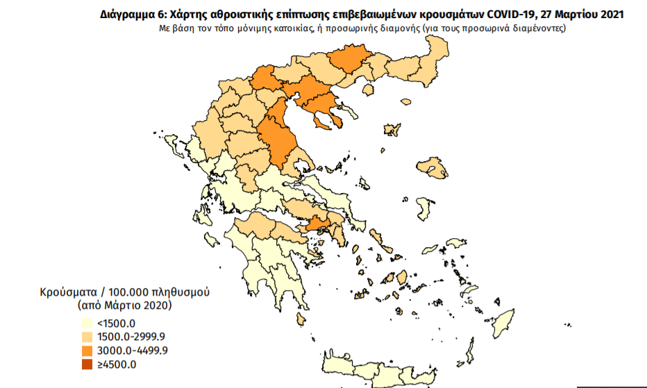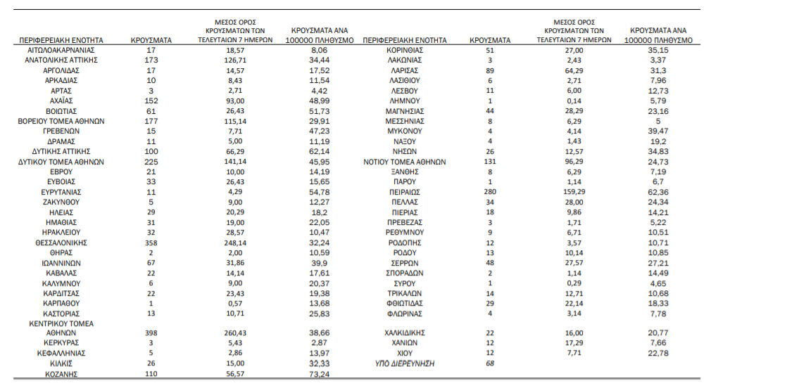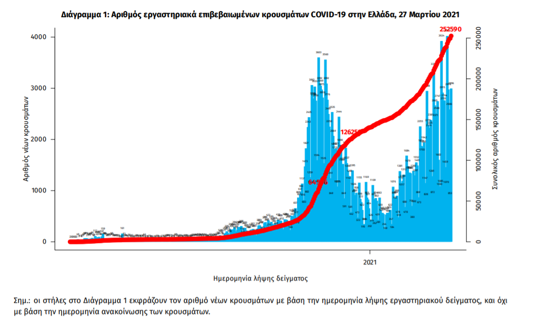 Τα νέα εργαστηριακά επιβεβαιωμένα κρούσματα της νόσου που καταγράφηκαν τις τελευταίες 24 ώρες είναι 3.133, εκ των οποίων 6 εντοπίστηκαν κατόπιν ελέγχων στις πύλες εισόδου της χώρας. Ο συνολικός αριθμός των κρουσμάτων ανέρχεται σε 252.590 (ημερήσια μεταβολή +1.3%), εκ των οποίων 51.5% άνδρες. 1 Με βάση τα επιβεβαιωμένα κρούσματα των τελευταίων 7 ημερών, 60 θεωρούνται σχετιζόμενα με ταξίδι από το εξωτερικό και 2.545 είναι σχετιζόμενα με ήδη γνωστό κρούσμα.