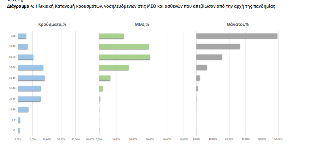 Ο αριθμός των ασθενών που νοσηλεύονται διασωληνωμένοι είναι 728 (64.4% άνδρες). Η διάμεση ηλικία τους είναι 68 έτη. To 82.4% έχει υποκείμενο νόσημα ή/και ηλικία 70 ετών και άνω. Από την αρχή της πανδημίας έχουν εξέλθει από τις ΜΕΘ 1.656 ασθενείς. Οι εισαγωγές2 νέων ασθενών Covid-19 στα νοσοκομεία της επικράτειας είναι 371 (ημερήσια μεταβολή -17.19%). Ο μέσος όρος εισαγωγών του επταημέρου είναι 451 ασθενείς. Η διάμεση ηλικία των κρουσμάτων είναι 44 έτη (εύρος 0.2 έως 105 έτη), ενώ η διάμεση ηλικία των θανόντων είναι 79 έτη (εύρος 0 έως 103 έτη).