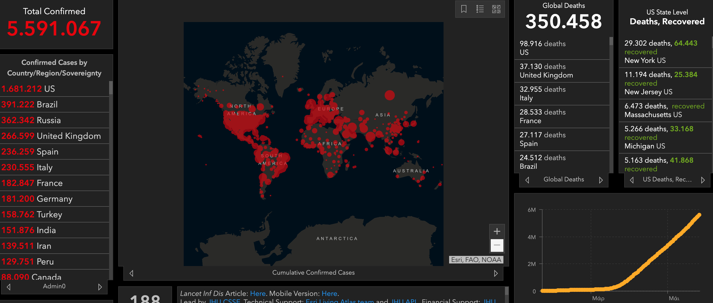 Μέχρι τις 22.00 (ώρα Ελλάδας, 26/5) είχαν καταγραφεί περισσότερα από 5.541.590 επιβεβαιωμένα κρούσματα σε 196 χώρες και εδάφη. Ο αριθμός αυτός των διαγνωσμένων μολύνσεων, ωστόσο, αντανακλά μόνο ένα κλάσμα του πραγματικού αριθμού λοιμώξεων, με μεγάλο αριθμό χωρών να εξετάζουν μόνο τα κρούσματα που απαιτούν νοσοκομειακή περίθαλψη. Τουλάχιστον 2.191.200 από αυτούς τους ασθενείς έχουν πλέον αναρρώσει.