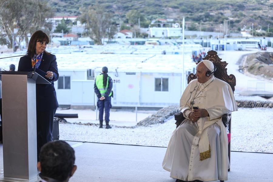 Στον χαιρετισμό της η κ. Σακελλαροπούλου υπενθύμισε ότι είναι «η δεύτερη φορά που επισκέπτεται ο Πάπας, ως προσκυνητής, έναν τόπο που ταυτίστηκε με το δράμα των προσφύγων». Και όπου όπως είπε «η κατάσταση, ευτυχώς, που επικρατεί σήμερα, είναι από κάθε άποψη αισθητά βελτιωμένη με εκείνη που επικρατούσε κατά την πρώτη σας επίσκεψη».