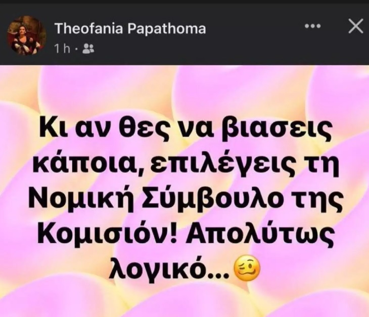 «Κι αν θες να βιάσεις κάποια, επιλέγεις τη Νομική Σύμβουλο της Κομισιόν! Απολύτως λογικό…», έγραψε χαρακτηριστικά η κ. Παπαθωμά παίρνοντας ξεκάθαρα το μέρος του Αλέξη Γεωργούλη.
