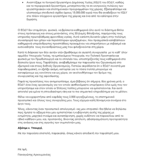 “Θέλω να ευχαριστήσω από καρδιάς τους 2.500 εργαζομένους του ΕΟΔΥ, το επιστημονικό προσωπικό και όλους τους συνεργάτες μου. Τους εύχομαι καλή δύναμη και συνέχεια στο έργο τους”, σημειώνει σε ανάρτησή του ο Π. Αρκουμανέας και συμπληρώνει: