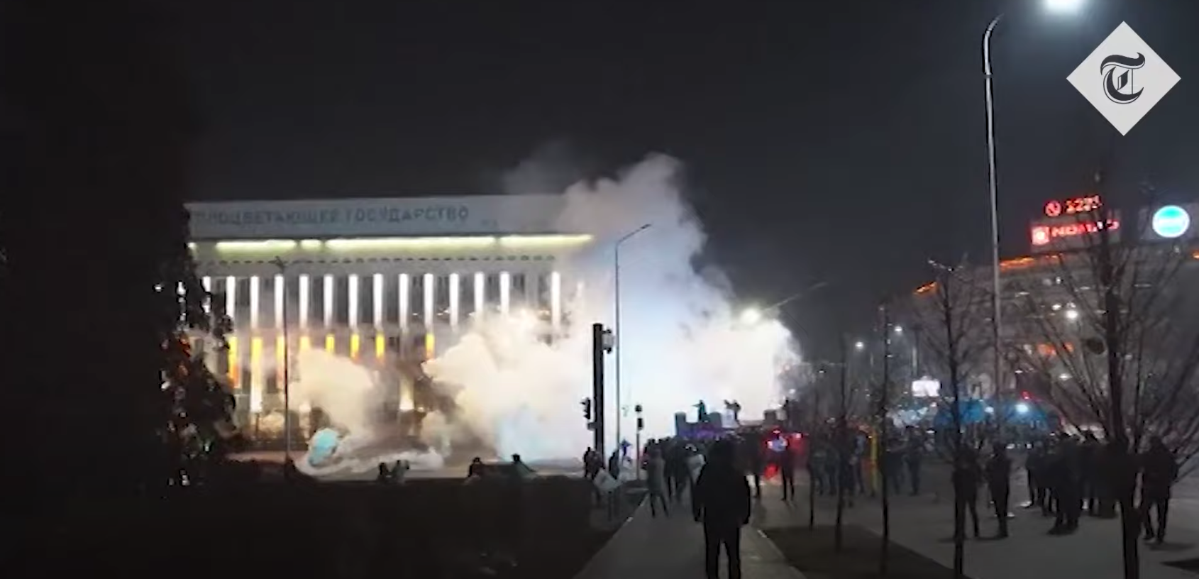 Το κτίριο του δημαρχείου στο Αλμάτι έχει περικυκλωθεί από διαδηλωτές οι οποίοι φαίνεται ότι κατάφεραν να σπάσουν την περίμετρο ασφαλείας που είχαν στήσει οι δυνάμεις της τάξης παρά τις βομβίδες κρότου-λάμψης που έριχναν αυτές. Οι εκρήξεις από τις βομβίδες κρότου-λάμψης ακούγονταν σε όλο το κέντρο της πόλης.