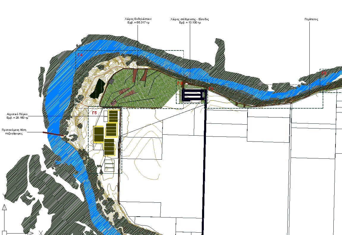 Η κεντρική ιδέα της πρότασης στο συγκεκριμένο σημείο, είναι η διαμόρφωση ενός εκτεταμένου άξονα κίνησης που θα φιλοξενεί την πεζή μετακίνηση και τη βόλτα με το ποδήλατο μήκους περίπου 2,3 χιλιομέτρων, με καθιστικά – βρύσες και χαμηλή φύτευση ενώ στο δυτικότερο άκρο της επέμβασης, προτείνεται η δημιουργία χώρου εκδηλώσεων και ενός εκπαιδευτικού – ερευνητικού αγροτικού πάρκου.