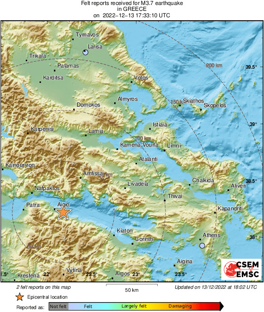 Σύμφωνα και με το Ευρωμεσογειακό Σεισμολογικό Κέντρο, η σεισμική δόνηση είχε μέγεθος 3,7 βαθμών της κλίμακας Ρίχτερ και το επίκεντρο ήταν 11 χιλιόμετρα, ανατολικά από το Αίγιο.