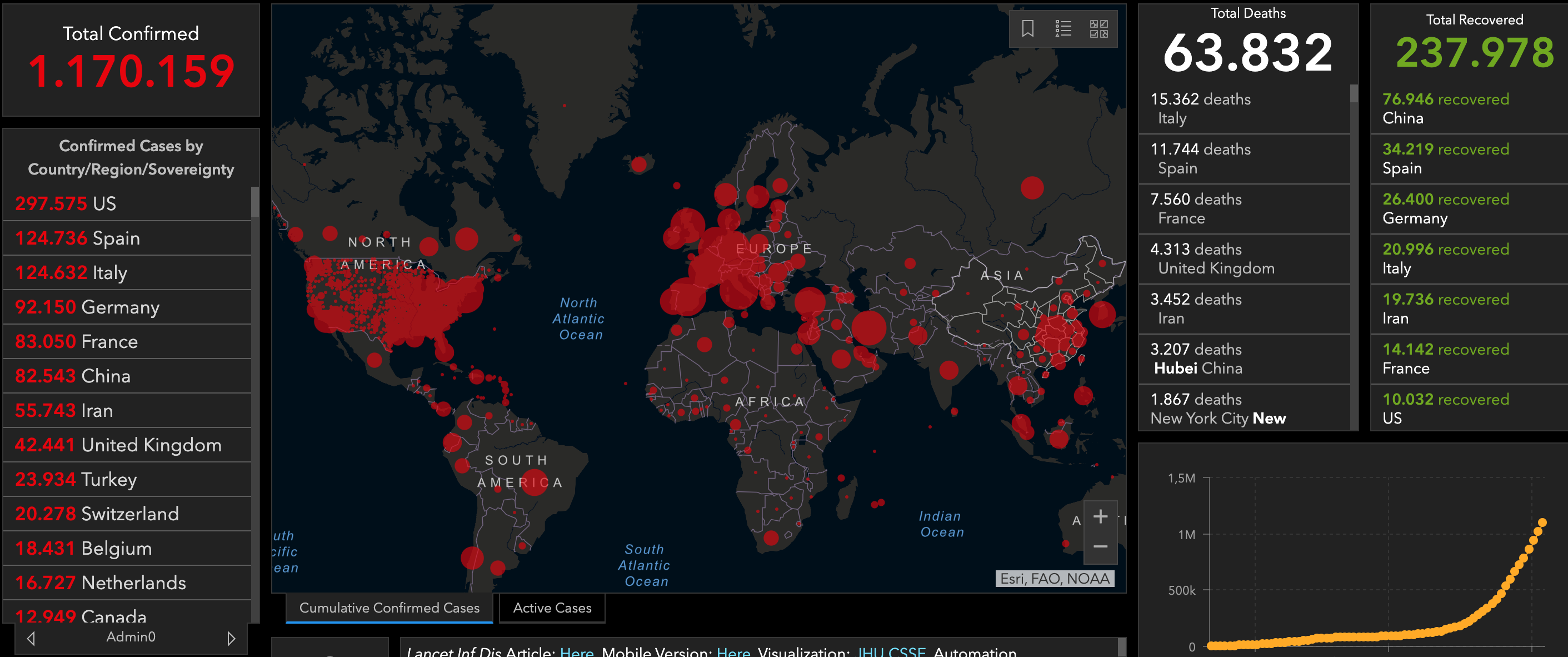 Με συνολικά 46.033 θανάτους (για 627.203 επίσημα δηλωμένα κρούσματα), η Ευρώπη είναι η ήπειρος που πλήττεται σκληρότερα από την πανδημία του Covid-19. Η Ιταλία (15.362) και η Ισπανία (11.744) είναι οι χώρες με τους περισσότερους θανάτους στον κόσμο. Η Γαλλία έχει 7.560 θανάτους στο έδαφός της, η Βρετανία έχει 4.313.