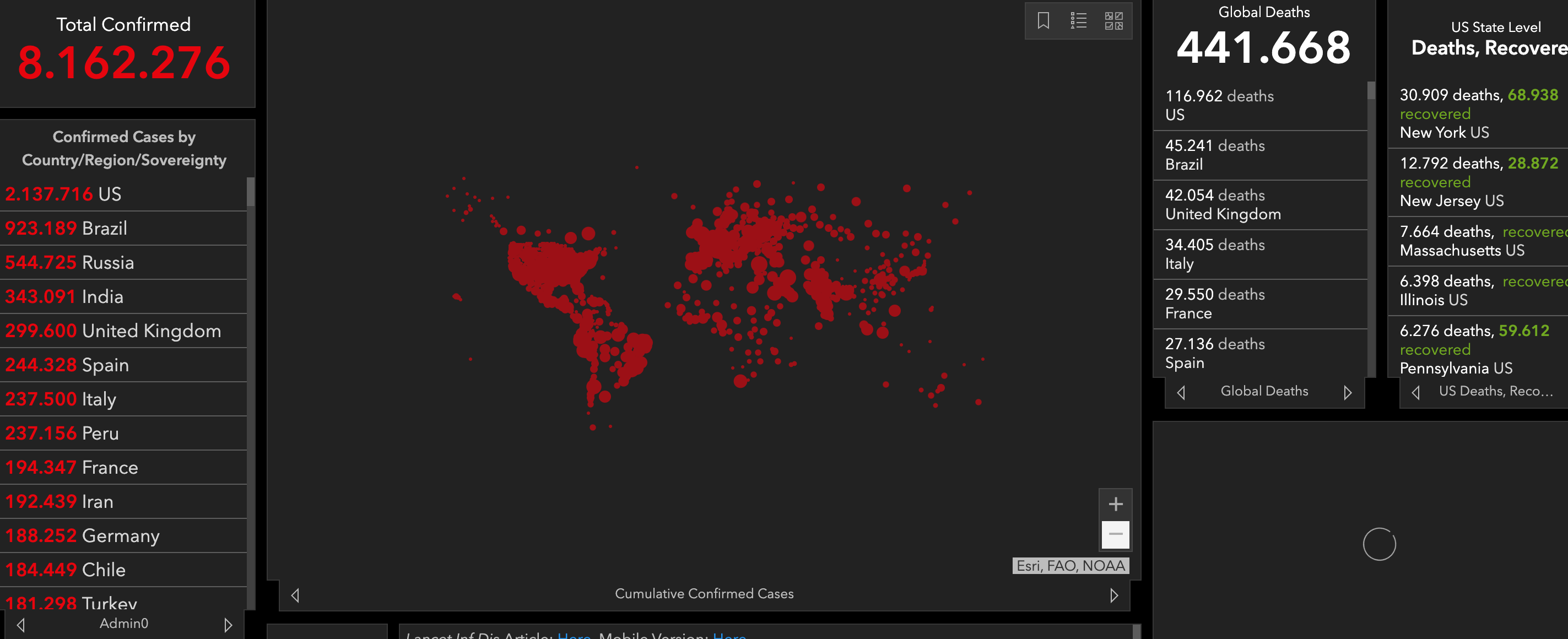 Περισσότεροι από 8.162.276 άνθρωποι έχουν διαγνωστεί με κορονοϊό επίσημα σε 196 χώρες και εδάφη από την έναρξη της επιδημίας, από τους οποίους τουλάχιστον 3.698.500 θεωρούνται θεραπευμένοι.