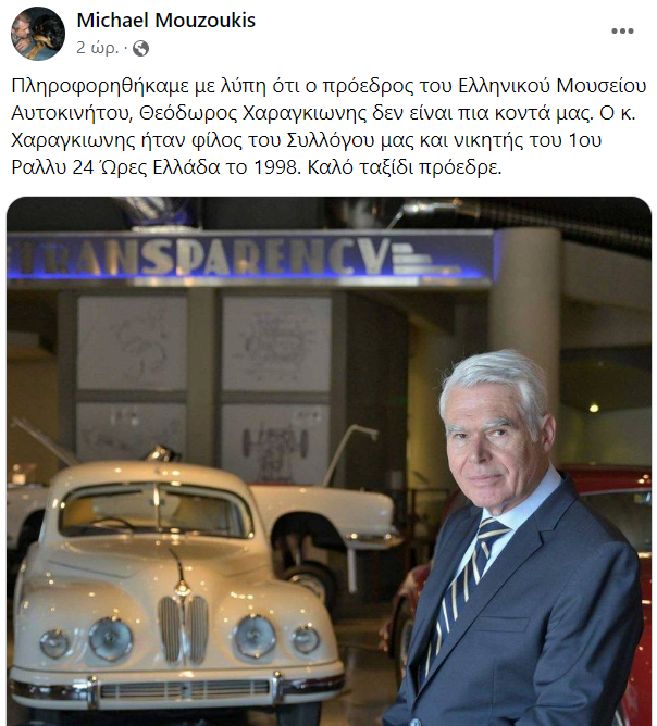 «Πληροφορηθήκαμε με λύπη ότι ο πρόεδρος του Ελληνικού Μουσείου Αυτοκινήτου, Θεόδωρος Χαραγκιώνης, δεν είναι πια κοντά μας. Ο κ. Χαραγκιώνης ήταν φίλος του συλλόγου μας και νικητής του 1ου Ραλλυ 24 Ωρες Ελλάδα το 1998. Καλό ταξίδι, πρόεδρε».