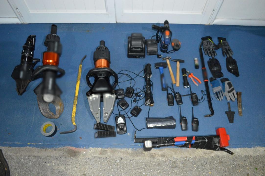 Επίσης, κατασχέθηκαν τρία οχήματα που χρησιμοποιούσαν και εντοπίστηκαν από τους αστυνομικούς σε περιοχές της Θεσσαλονίκης και του Κιλκίς, όπου από το εσωτερικό τους βρέθηκαν και κατασχέθηκαν πλήθος εξειδικευμένων διαρρηκτικών εργαλείων, (ηλεκτρικός και υδραυλικός διαστολέας μετάλλων, ηλεκτρικό ψαλίδι κοπής μετάλλων, μεταλλικές ράβδοι και λοστοί, σφυριά, κατσαβίδια κ.α.) ένα σπρέι πιπεριού, πέντε φορητοί πομποδέκτες, τέσσερα ζευγάρια γάντια και διάφορα έγγραφα.
