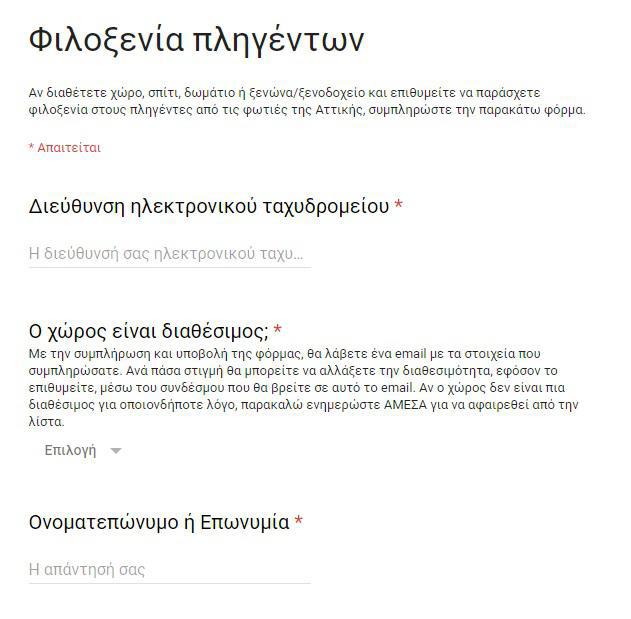 Στην ειδική φόρμα, καλείται να συμπληρώσει κανείς το είδος του χώρου που διαθέτει (μονοκατοικία, διαμέρισμα κ.α.), τον αριθμό ατόμων που μπορεί να φιλοξενήσει καθώς και το χρονικό διάστημα για το οποίο προσφέρει τον χώρο.