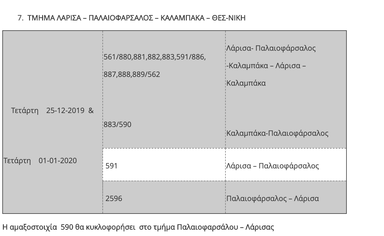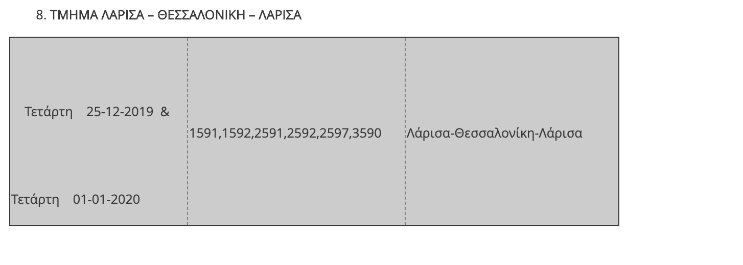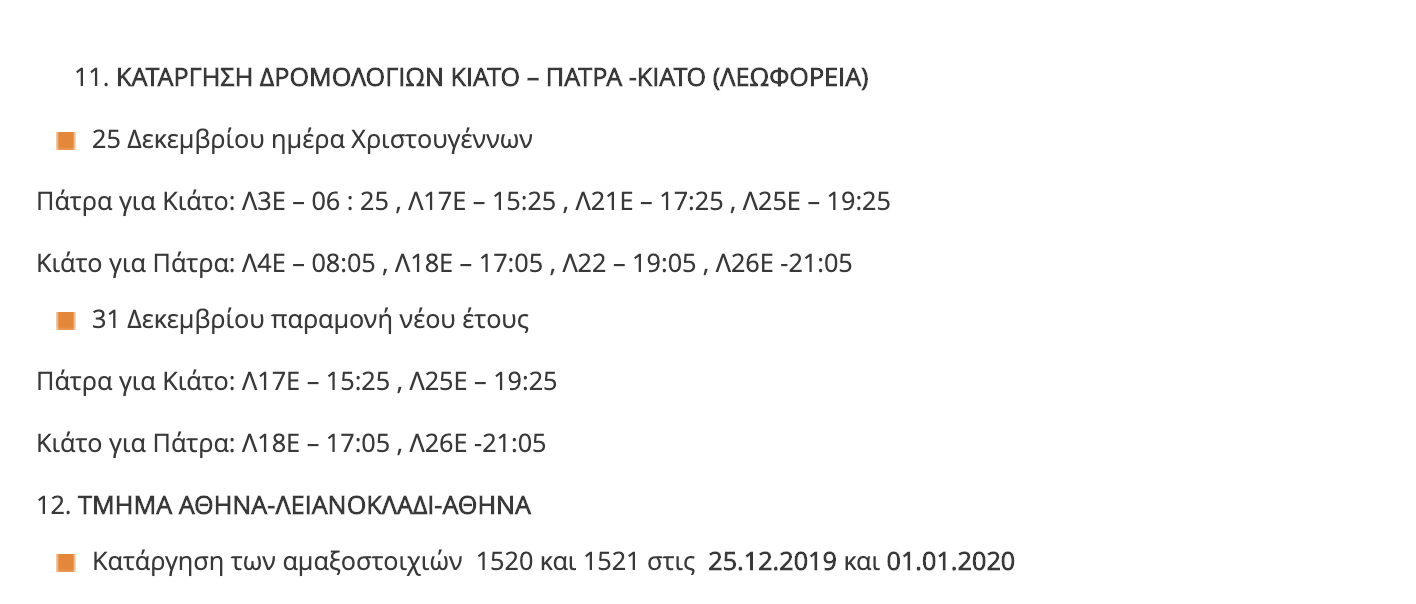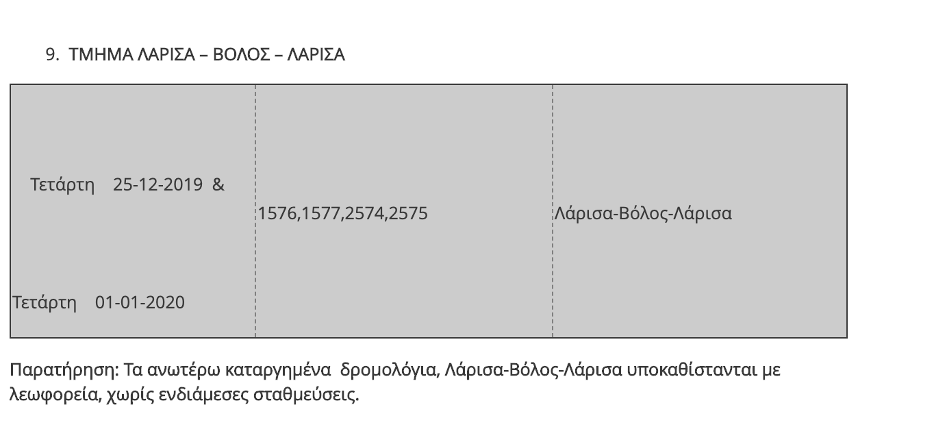 Η ΤΡΑΙΝΟΣΕ Α.Ε. ενημερώνει το επιβατικό κοινό ότι, όπως κάθε χρόνο, παραμονή και ανήμερα των Χριστουγέννων και της Πρωτοχρονιάς αναστέλλεται η κυκλοφορία ορισμένων τοπικών δρομολογίων του δικτύου καθώς και των προαστιακών γραμμών, λόγω της μειωμένης επιβατικής κίνησης που παρατηρείται σε συγκεκριμένες διαδρομές.