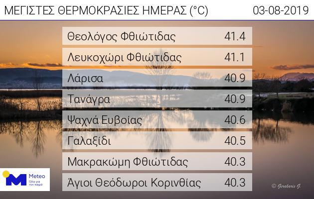 Κορυφώθηκε το κύμα ζέστης τις μεσημεριανές ώρες του Σαββάτου 03/08, με τις μέγιστες θερμοκρασίες να ξεπερνούν τους 41 ⁰C στη Θεσσαλία, τη Φθιώτιδα, τη Βοιωτία και την Ανατολική Πελοπόννησο, όπως καταγράφτηκε από το δίκτυο αυτόματων μετεωρολογικών σταθμών του Εθνικού Αστεροσκοπείου Αθηνών.