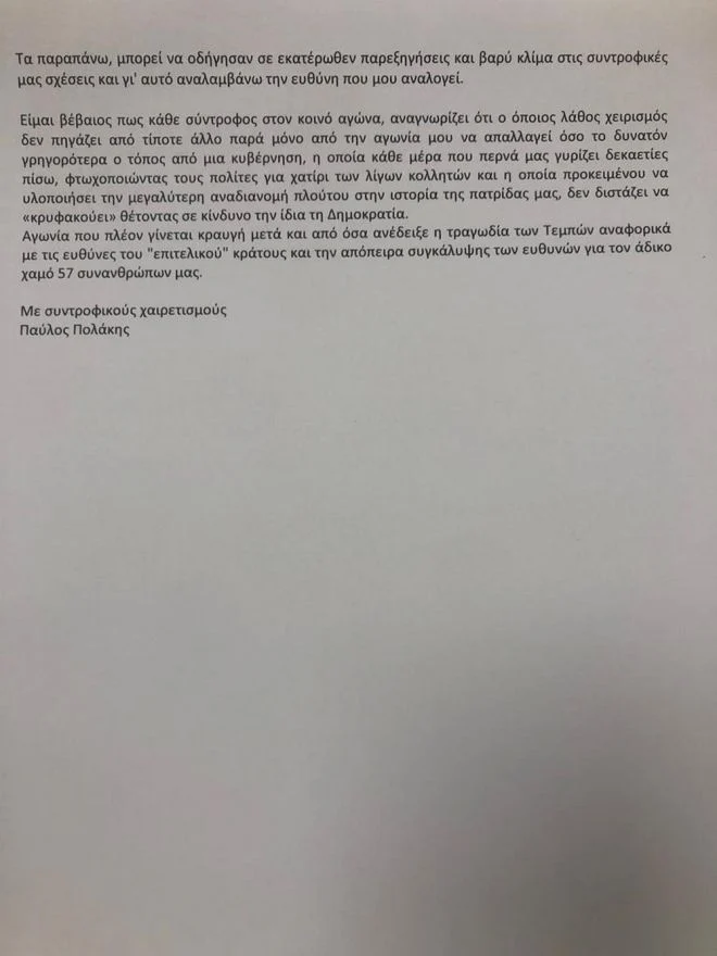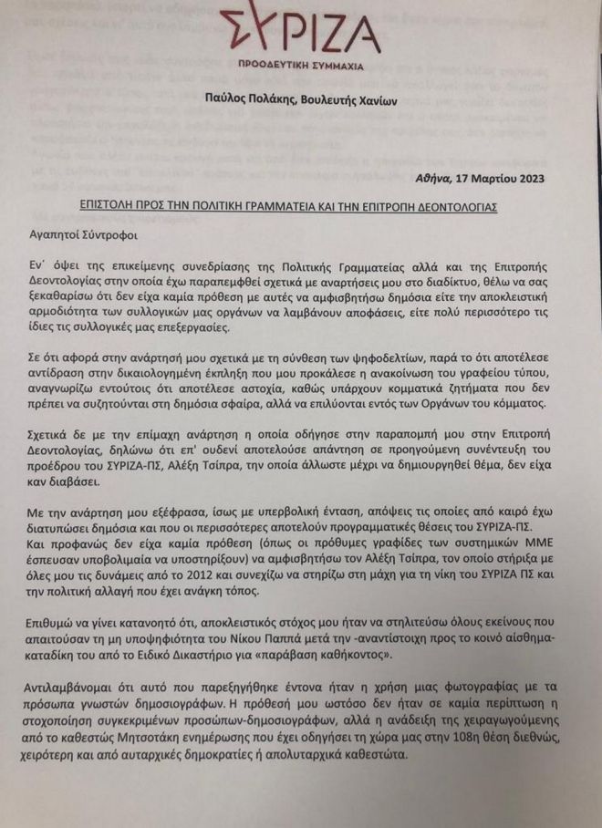 Τις αποφάσεις για τον Π. Πολάκη θα λάβουν τα συλλογικά όργανα του ΣΥΡΙΖΑ, ενώ η επιστολή έχει ως ακολούθως: