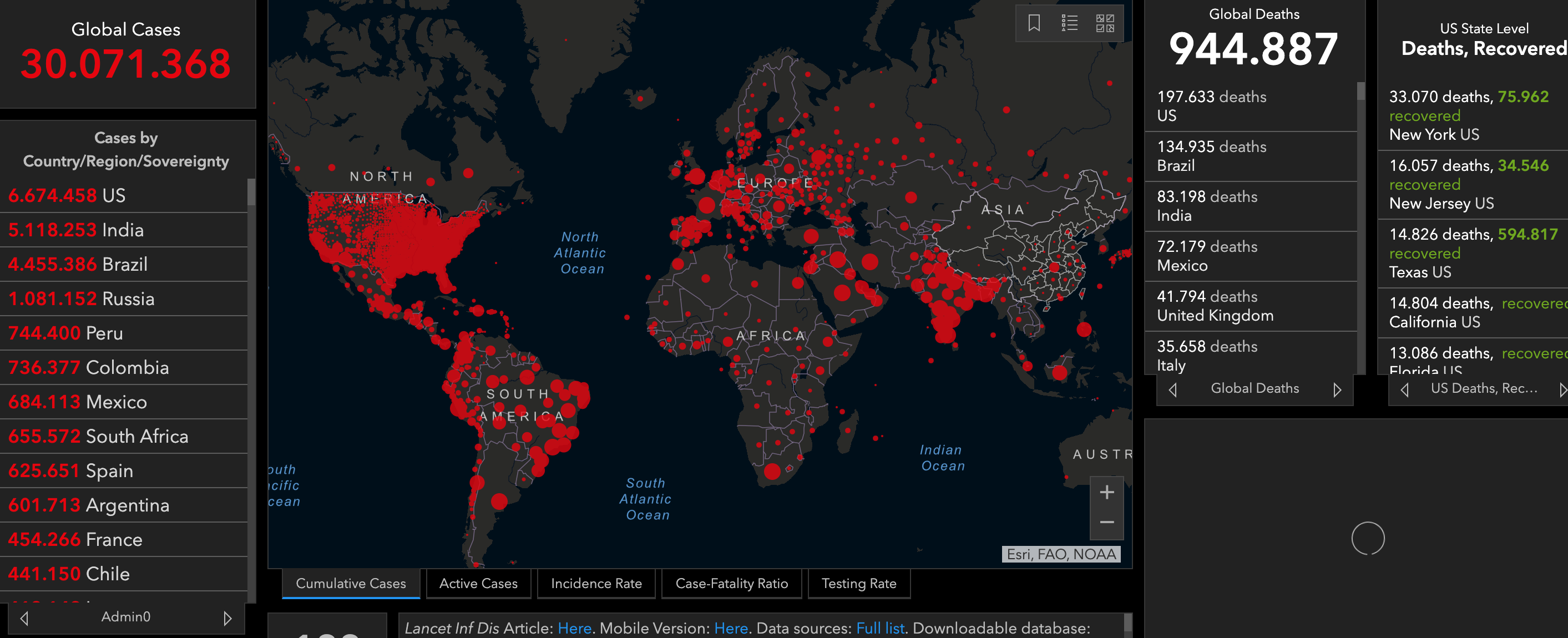 Η πανδημία έχει στοιχίσει τη ζωή σε τουλάχιστον 946.727 ανθρώπους παγκοσμίως από τα τέλη Δεκεμβρίου με τα επιβεβαιωμένα κρούσματα να ξεπερνούν τα 30,2 εκατομμύρια.