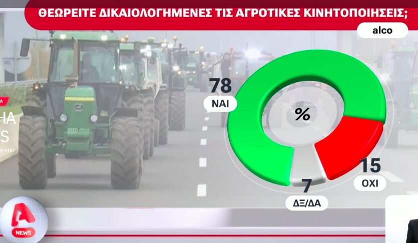 Δικαιολογημένες χαρακτηρίζουν οι πολίτες τις αγροτικές κινητοποιήσεις σύμφωνα με δημοσκόπηση της ALCO για την τηλεόραση του ALPHA.