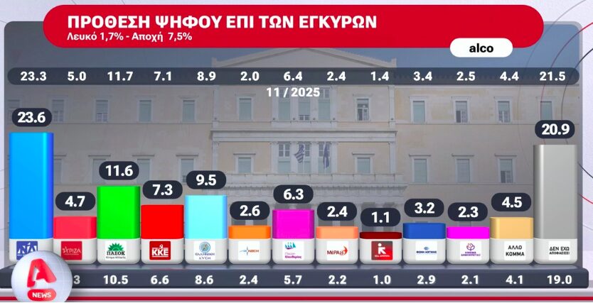 Στο 23,6% η Νέα Δημοκρατία, στο 11,6% το ΠΑΣΟΚ. Στο 9,5% η Ελληνική Λύση στη νέα δημοσκόπηση