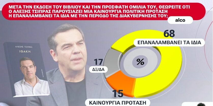 Ενδιαφέρον παρουσιάζουν και τα ευρήματα για τον Αλέξη Τσίπρα. Ειδικότερα, στο ερώτημα «Μετά την έκδοση του βιβλίου και την πρόσφατη ομιλία του, θεωρείτε ότι ο Αλέξης Τσίπρας παρουσιάζει μία καινούργια πολιτική πρόταση ή επαναλαμβάνει τα ίδια με την περίοδο της διακυβέρνησης του» οι ερωτηθέντες απαντούν:
