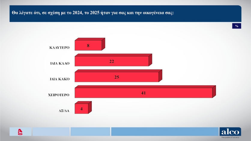 Οι πολίτες προχωρούν σε έναν σκληρό απολογισμό για τη χρονιά που φεύγει. Στο ερώτημα «θα λέγατε ότι, σε σχέση με το 2024, το 2025 ήταν για εσάς και την οικογένειά σας», η απάντηση «χειρότερο» κυριαρχεί με ποσοστό 41%.