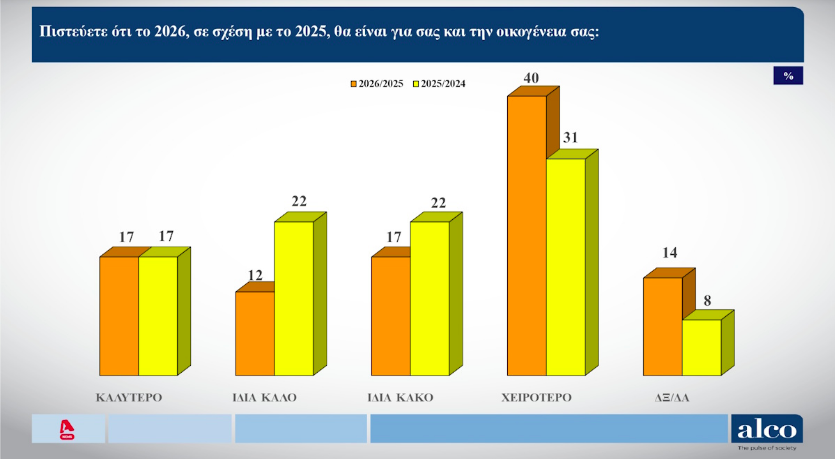 Πάντως, οι προσδοκίες για το νέο έτος δεν αφήνουν περιθώρια αισιοδοξίας. Στο ερώτημα «πιστεύετε ότι το 2026, σε σχέση με το 2025, θα είναι για σας και την οικογένειά σας», το 40% των ερωτηθέντων απαντά «χειρότερο».