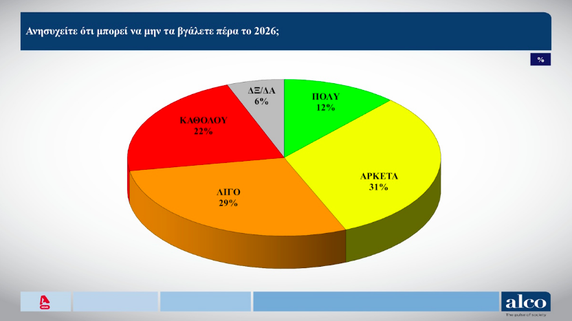 Η οικονομική ανασφάλεια αποτυπώνεται ξεκάθαρα στη δημοσκόπηση ALCO και στο ερώτημα που αφορά στη βιωσιμότητα των νοικοκυριών. Στην ερώτηση «ανησυχείτε ότι μπορεί να μην τα βγάλετε πέρα το 2026;», η συντριπτική πλειονότητα εκφράζει φόβο.