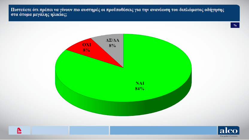 Τέλος, η δημοσκόπηση ALCO έθεσε και ένα ζήτημα οδικής ασφάλειας που απασχολεί την επικαιρότητα. Στο ερώτημα «πιστεύετε ότι πρέπει να γίνουν πιο αυστηρές οι προϋποθέσεις για την ανανέωση του διπλώματος οδήγησης στα άτομα μεγάλης ηλικίας;», η κοινωνική συναίνεση είναι καθολική.