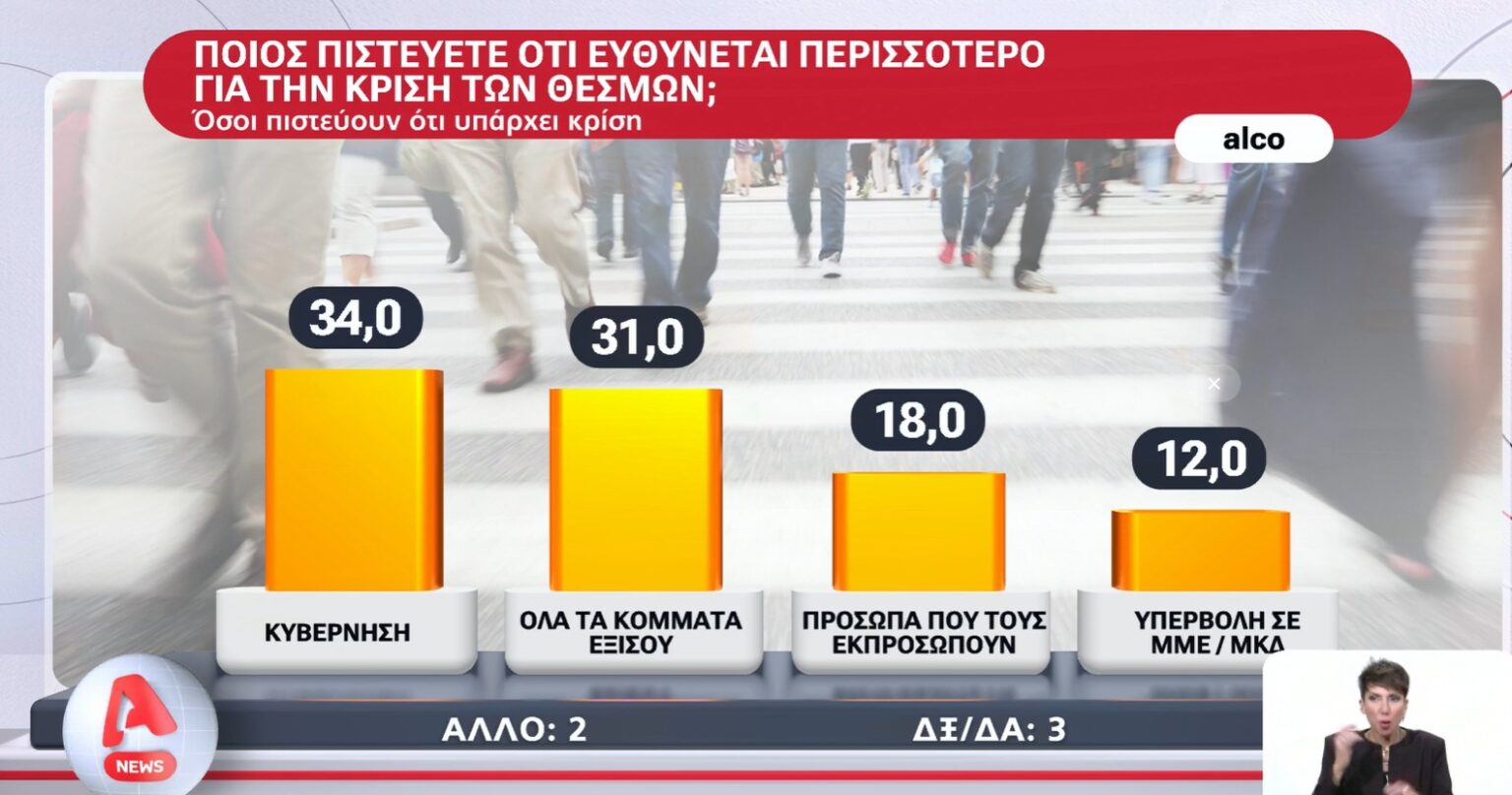 Ειδικότερα, στο ερώτημα «Ποιος πιστεύετε ότι ευθύνεται περισσότερο για την κρίση των θεσμών» όσοι πιστεύουν ότι υπάρχει κρίση απαντούν:
