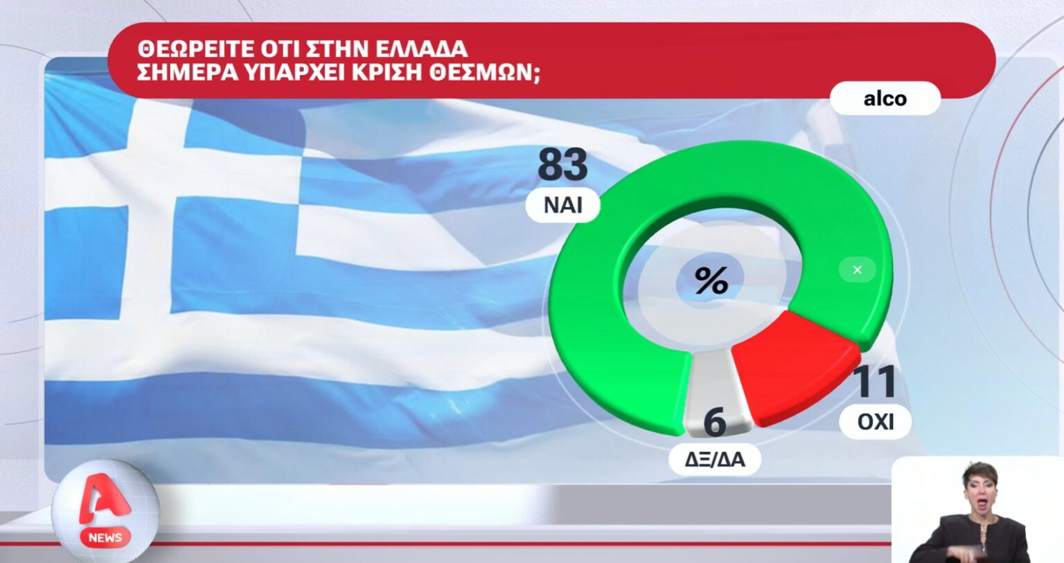 Στο ερώτημα αν υπάρχει κρίση θεσμών στη χώρα μας το 83% των ερωτηθέντων απαντά το 83%, όχι μόλις το 11% και ΔΞ/ΔΑ το 6%.