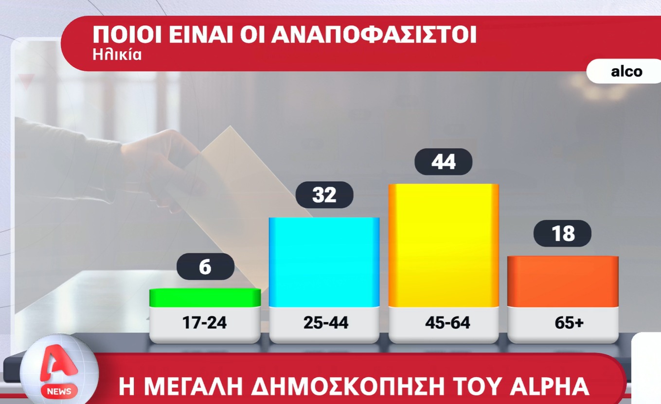 Όσον αφορά στο προφίλ των αναποφάσιστων το 6% είναι ηλικίας 17-24, το 32% ηλικίας 25-44, το 44% ηλικίας 45-64 και το 18% ηλικίας 65+.