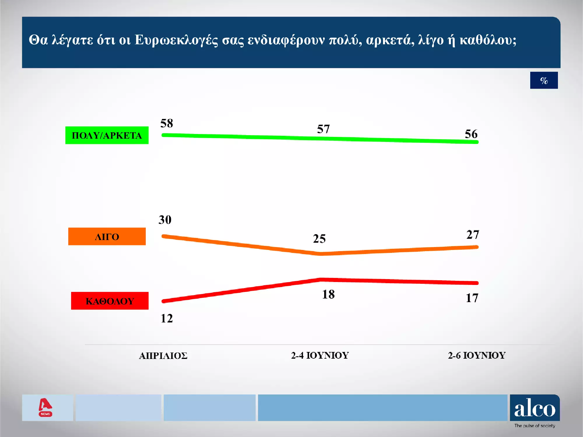 Στην ερώτηση για το πόσο σας ενδιαφέρουν οι ευρωεκλογές το 56% λέει πολύ ή αρκετά, το 27% λέει λίγο και το 17% λέει καθόλου.