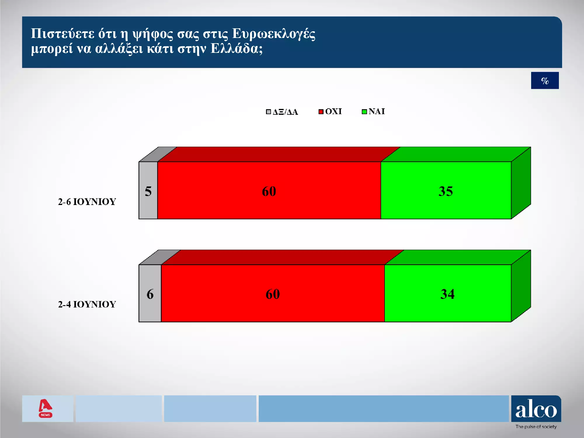 Στην ερώτηση αν η ψήφος στις ευρωεκλογές μπορεί να αλλάξει κάτι στην Ελλάδα το 60% λέει όχι και το 35% λέει ναι.