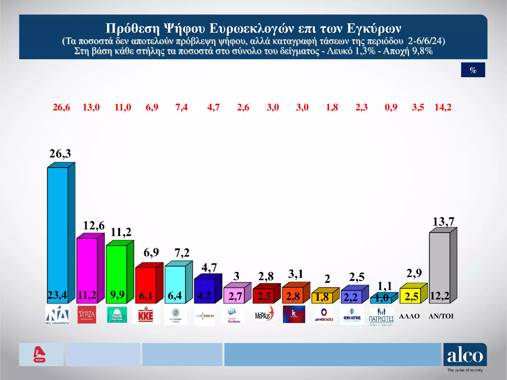 Η Νέα Δημοκρατία παραμένει κυρίαρχη λίγα 24ωρα πριν τις ευρωεκλογές της Κυριακής (09/06/2024) σύμφωνα με τη δημοσκόπηση της Alco.