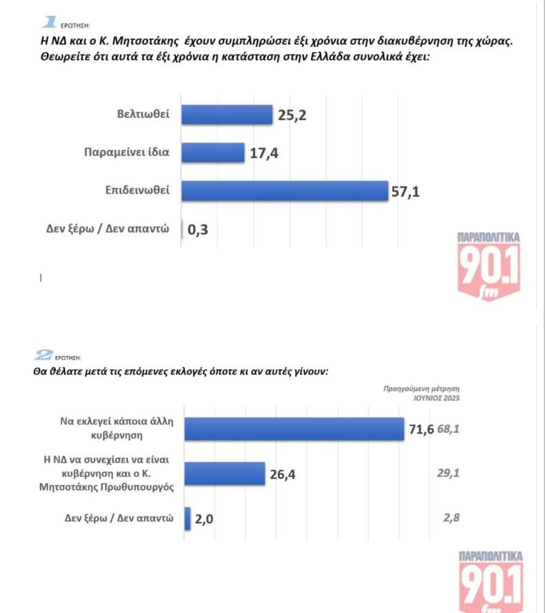 Ειδικότερα το 57,1% των πολιτών θεωρεί ότι έξι χρόνια μετά την ανάληψη της κυβέρνησης από τον Κυριάκο Μητσοτάκη και τη ΝΔ η κατάσταση στη χώρα έχει επιδεινωθεί, και μόλις το 25,2% βλέπει βελτίωση, ποσοστό που προέρχεται κατά βάση από τους ψηφοφόρους της.