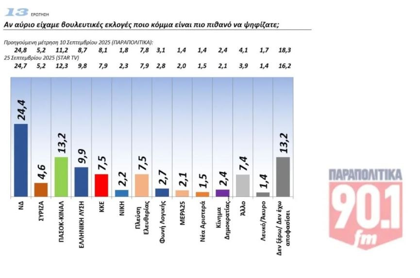 Στην πρόθεση ψήφου, η Νέα Δημοκρατία καταγράφει 24,4%, ελαφρώς μειωμένη από τον προηγούμενο μήνα, ενώ το ΠΑΣΟΚ με 13,2% κερδίζει περίπου μία ποσοστιαία μονάδα.
