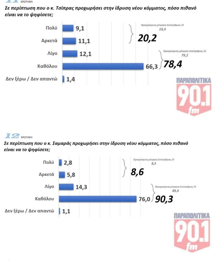 Στο μεταξύ, στην ερώτηση «πόσο πιθανό είναι να ψηφίζατε ένα κόμμα Τσίπρα», το 20,2% (9,1% πολύ πιθανό + 11,1% αρκετά πιθανό) δηλώνει ότι θα μπορούσε να το στηρίξει.